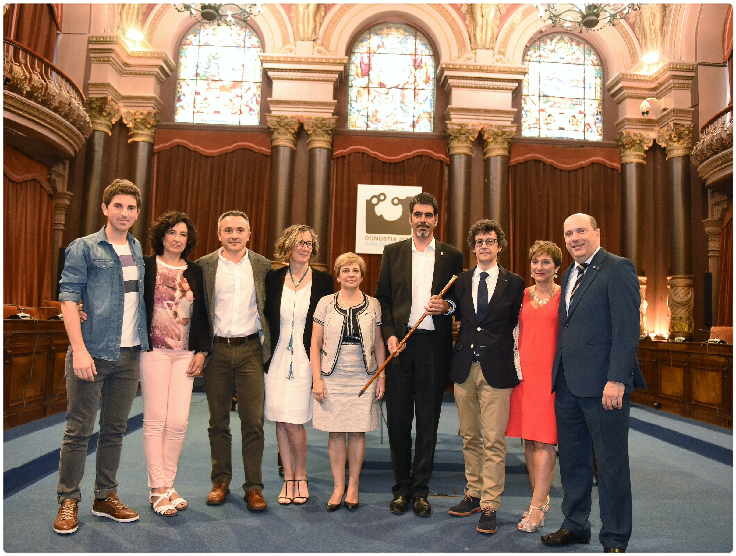 La presidenta del Parlamento Vasco, Bakartxo Tejería; la presidenta de las Juntas Generales de Gipuzkoa, Eider Mendoza; y la consejera de Desarrollo Económico y Competitividad, Arantxa Tapia, así como otras muchas autoridades, familiares y alderdikides han asistido al acto de investidura para mostrar su apoyo a Eneko Goia y su Gobierno municipal.