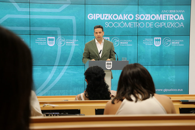 Imanol Lasa, el diputado de Gobernanza y Comunicación con la Sociedad, ha presentado esta mañana los datos de la encuesta que la Diputación ha realizado con el fin de continuar recogiendo la opinión y el sentir de la ciudadanía guipuzcoana sobre la situación actual y futura de Gipuzkoa, así como sobre distintas cuestiones de interés para el territorio. Se han realizado 1.500 entrevistas entre el 11 y el 15 de junio, englobando cinco apartados: economía y empleo; confianza institucional; refrendo ciudadano a diversos temas –los últimos acontecimientos políticos a nivel estatal relacionados con el cambio de gobierno en el Estado y el procèscatalán– valoración de la Diputación e intención de voto.