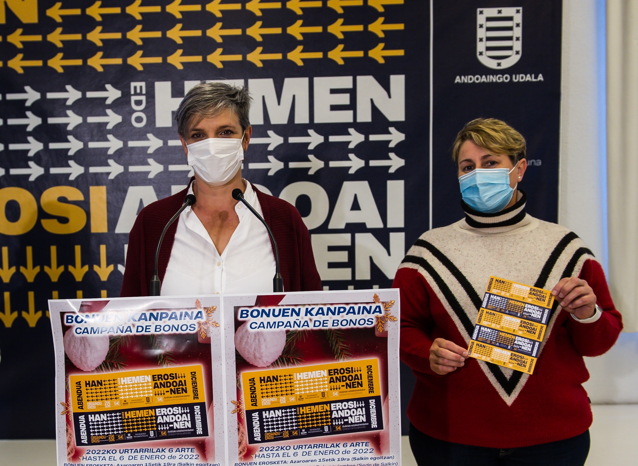 El Ayuntamiento de Andoain pondrá a disposición de las y los andoaindarras una nueva partida de bonos de consumo de cara a la próxima Navidad. De esta manera, la campaña HAN EDO HEMEN, EROSI ANDOAINEN, impulsada por Departamento de Promoción Económica, Empleo y Juventud en colaboración con la Asociación SALKIN, pondrá en circulación 1.600 nuevos bonos que se destinarán al consumo en los comercios y establecimientos hosteleros de la localidad. A tal efecto, los bonos tendrán un valor de 50 euros y se venderán al público a un precio de 25 euros, para lo que el Ayuntamiento abonará la mitad restante.