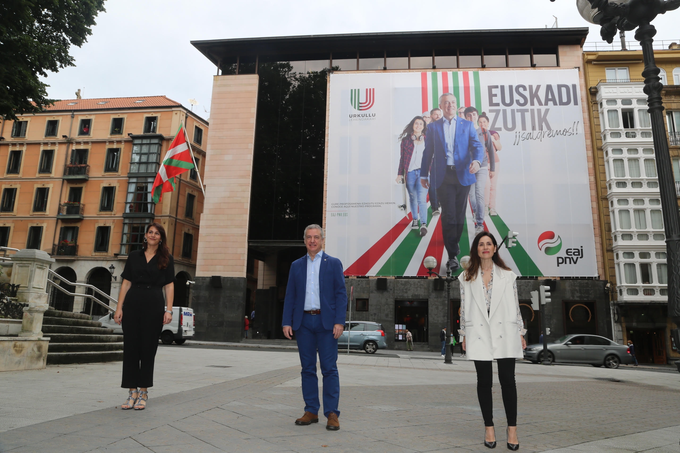 Batzarrean hitza hartu aurretik, Urkulluk, Arrizabalagak eta Tejeriak hauteskunde garaian jeltzaleen egoitzako fatxadan jarri ohi den lona erraldoiaren aurkezpena egin dute. Lonan aurkezten da talde jeltzaleak uztailaren 12ko Euskadiko Hauteskundeetara eramango duen goiburua: ‘Euskadi Zutik. ¡Saldremos!’. Krisialdi latz honen ondoren datorkigun etorkizuna zalantzak eta ziurgabetasunez beteta dago. Ez da erraza izango, pandemia honek gure bizimodua kinka larrian jarri duelako. Hainbat gauza daude betiko aldatu dituenak… baina beste batzuk ez dira aldatuko. Ez da aldatu arazoei aurre egiteko orduan daukagun jarrera. Euskadin, betidanik, hazi egiten gara arazoak datozenean. Zutik jartzen gara, beti. ‘Euskadi Zutik’ goiburuak jarrera hori islatzen du eta EAJ-PNVk hurrengo hauteskunde kanpainan erakutsi nahi du. Herri oso baten jarrera da, lehenago geunden egoerara itzultzeko eta, ahal badugu, are egoera hobeago batera iritsi ahal izateko. ‘Saldremos’ esatean ez dugu itzulpenik egin nahi, kontzeptu osagarria baita. Erronka honi aurrera egin nahi diogu baikortasunez, oztopo guztiak gainditzen jakingo dugulako, orain arte bezala.